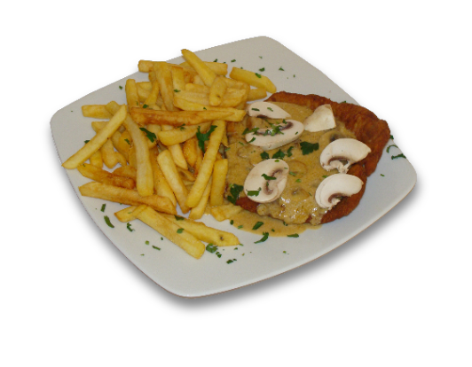 77 | Jägerschnitzel G mit Jägersauce, Pommes Frites oder Reis und Salat | 11,00 |